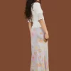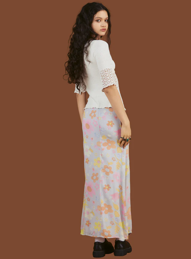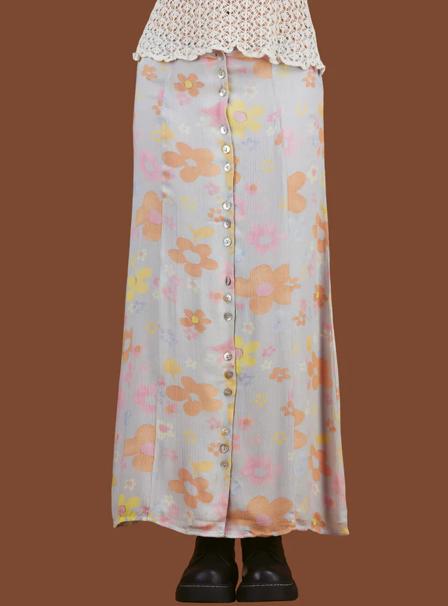 The Dew Skirt is a maxi skirt update of our Dew Dress. Beautiful floral-patterned flowy rayon material perfect for warmer weather, featuring mother of pearl buttons down the front. Fit is true to size. Model is 5'10" and wearing a size S. *This item is final sale and is not eligible for return or exchange 100% Rayon I