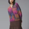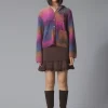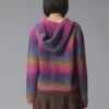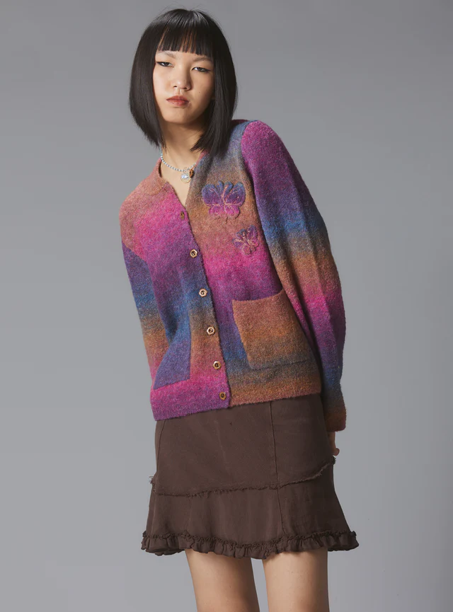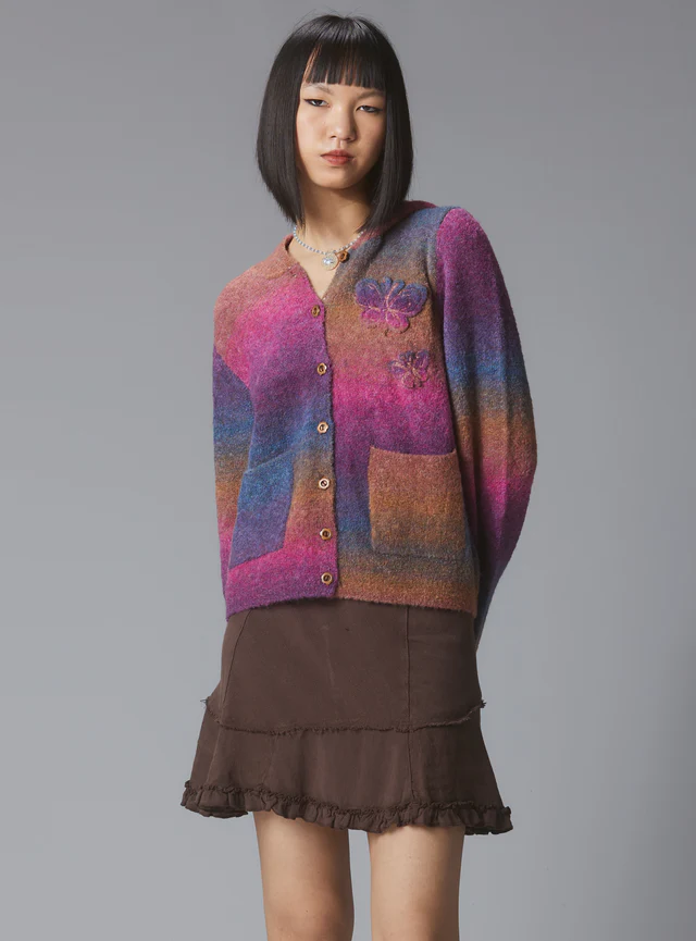 *This item is excluded from the VIP30 promotion The Fader Sweater is a knit rainbow hooded sweater with wooden flower buttons down the front, front patch pockets, and applique butterfly details on the front. Fit is slightly oversized but take your normal size. Model is 5'9" and wearing a size S. 63% Acrylic; 23% Nylon
